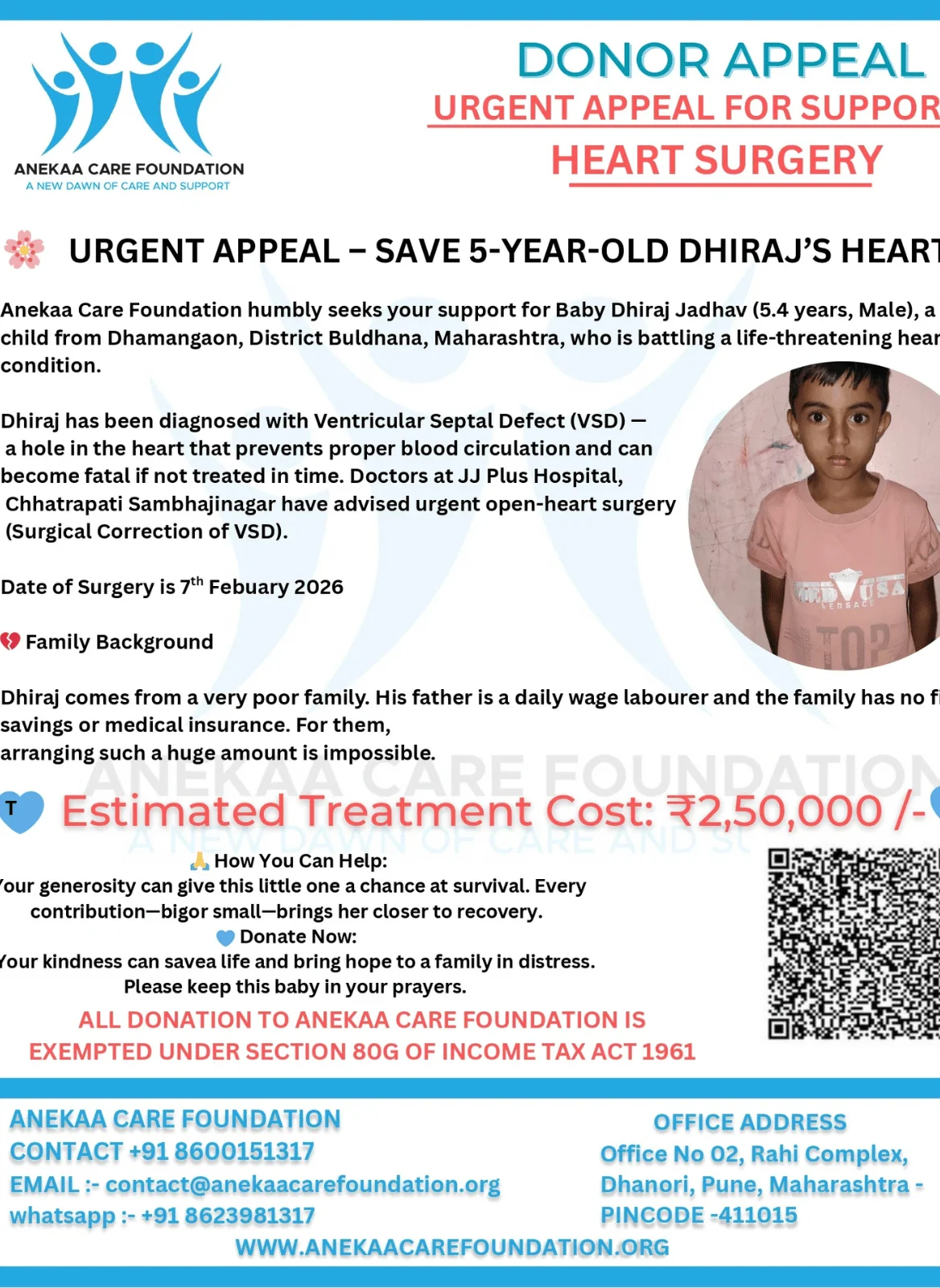 His father works as a daily wage labourer, and the family has no savings or medical insurance. The cost of heart surgery is far beyond their means, making external support the only hope to save Dhiraj’s life.