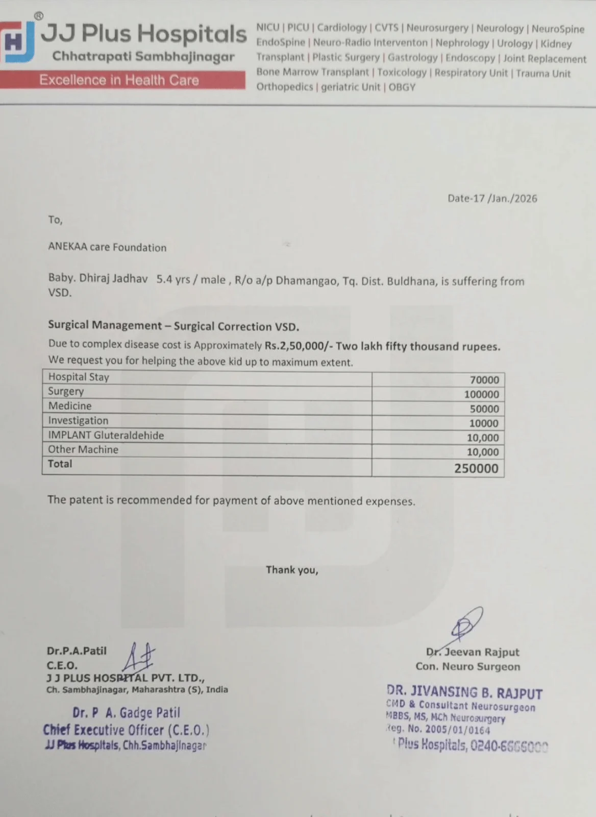 Baby Dhiraj Jadhav, aged 5.4 years, is suffering from a serious congenital heart condition known as Ventricular Septal Defect (VSD). This condition involves a hole in the heart that disrupts normal blood circulation and can become life-threatening if left untreated. Doctors at JJ Plus Hospital, Chhatrapati Sambhajinagar have advised urgent open-heart surgery (Surgical Correction of VSD). Without timely medical intervention, Dhiraj’s condition may deteriorate rapidly.