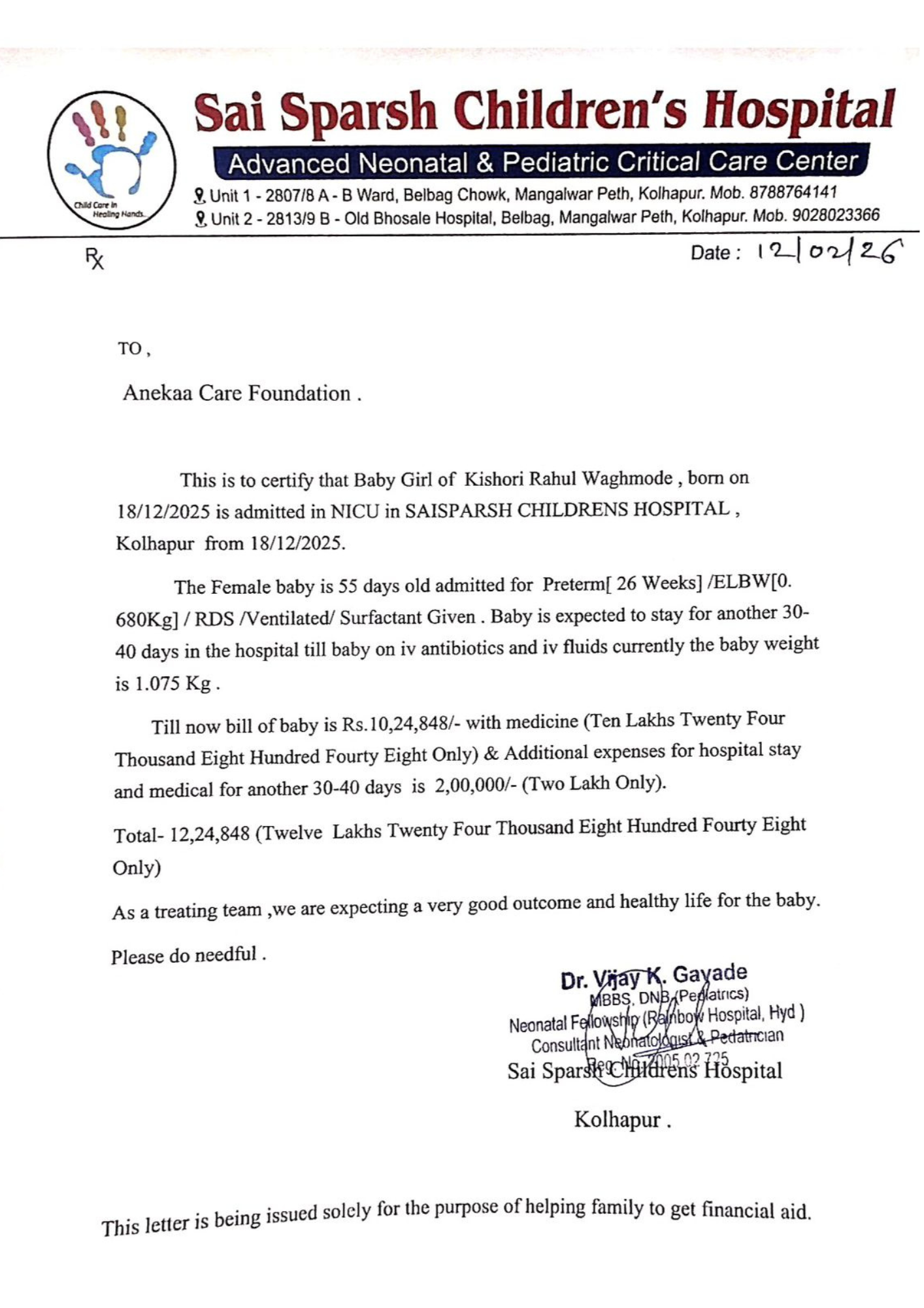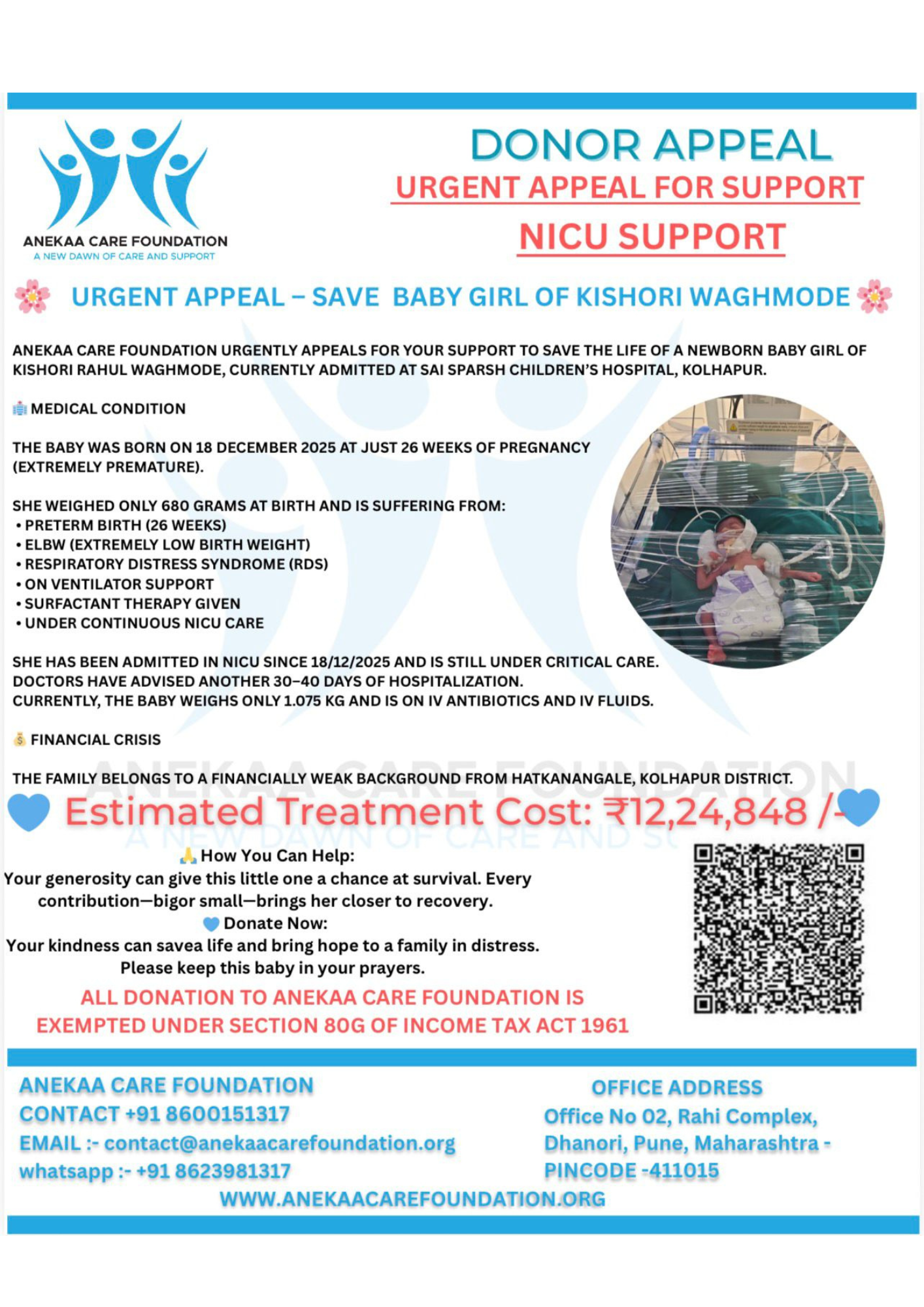 A newborn baby girl of Kishori Rahul Waghmode is fighting for her life in the NICU at Sai Sparsh Children’s Hospital, Kolhapur.