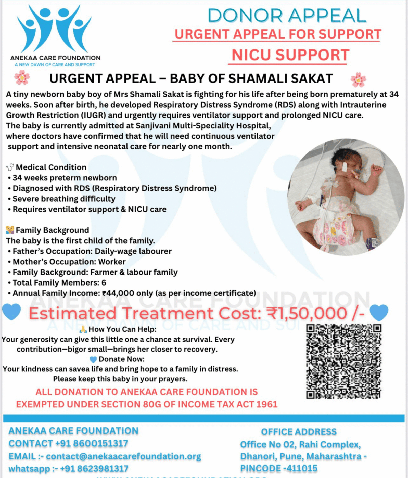 Anekaa Care Foundation humbly appeals for your support to help save the life of a newborn baby boy who is fighting for survival every single second.