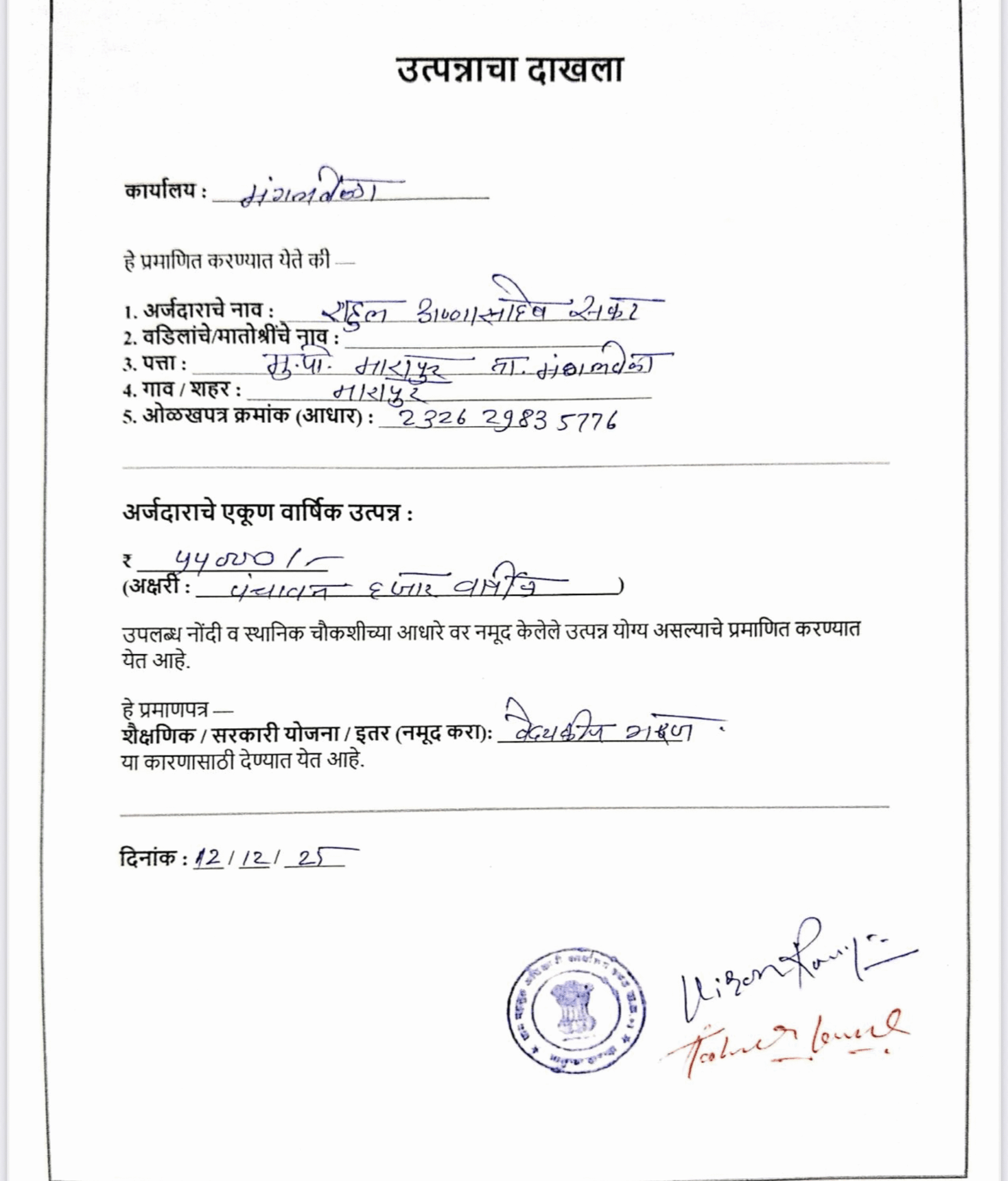 Annual Family Income: ₹44,000 only (as per income certificate)