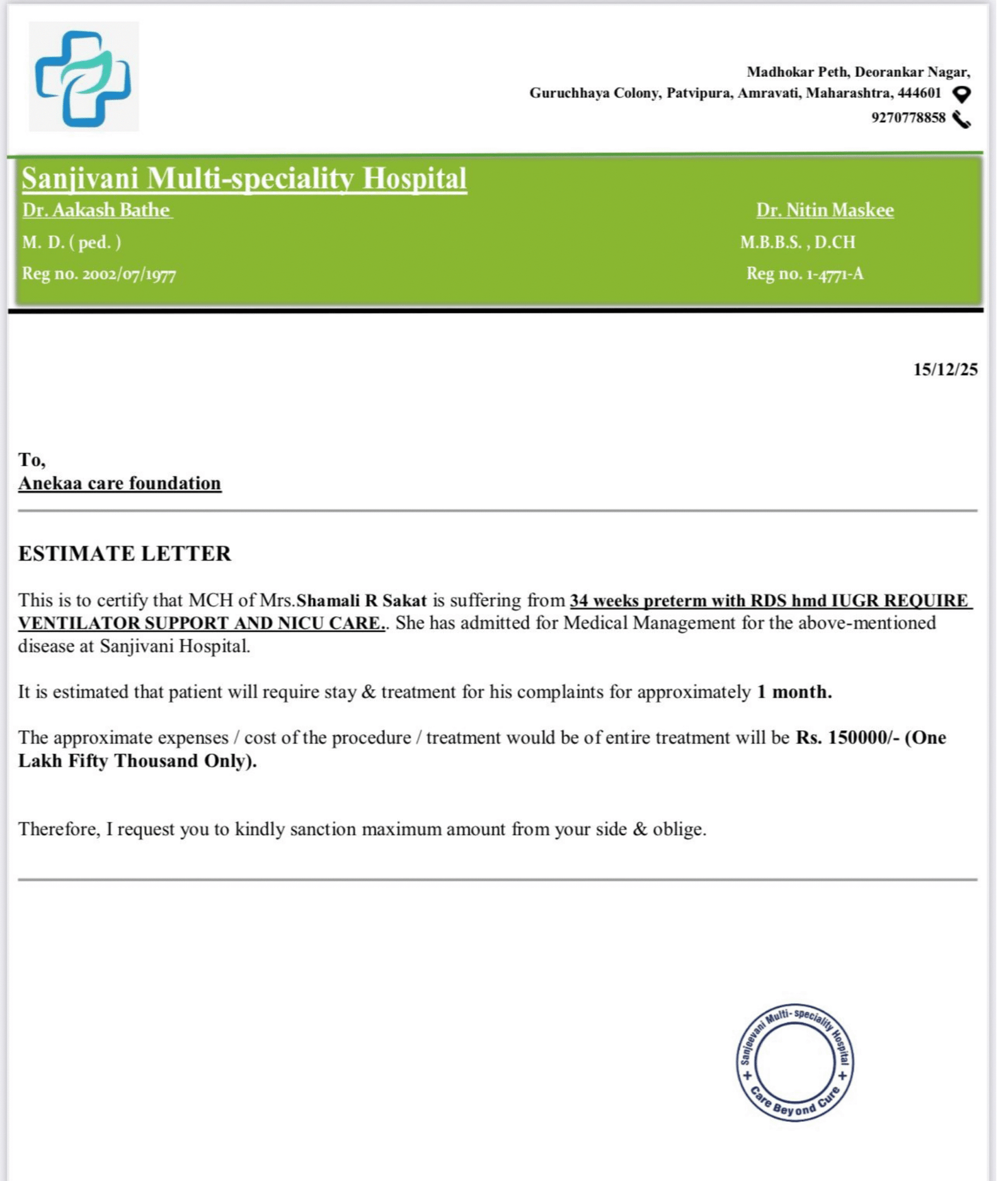 His father, Mr. Abhijit Bhupal Pawar, a resident of Kolhapur, earns just ₹1,50,000 annually. Despite working tirelessly to support his family, the cost of saving his baby’s life has become unbearable. The family has exhausted all savings and has no financial support left.