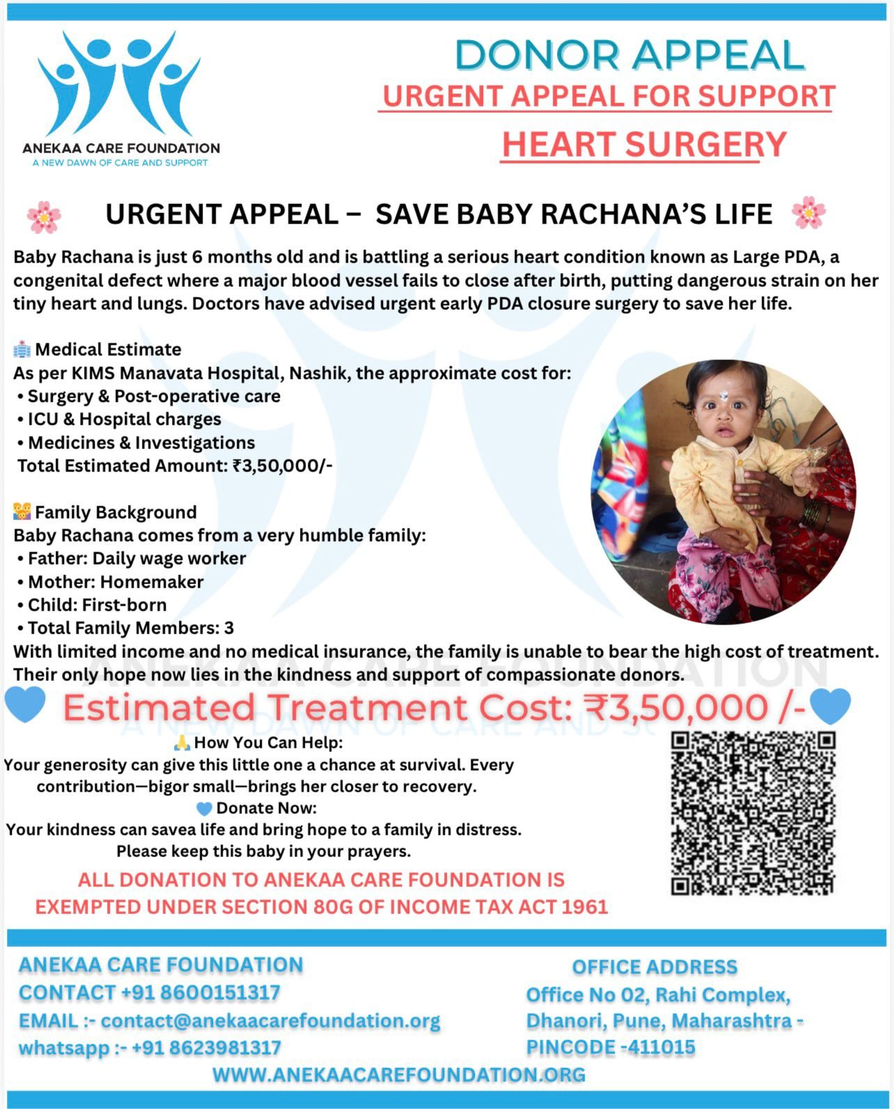 Anekaa Care Foundation humbly appeals to donors, well-wishers, and supporters to come forward and help save Baby Rachana’s life.