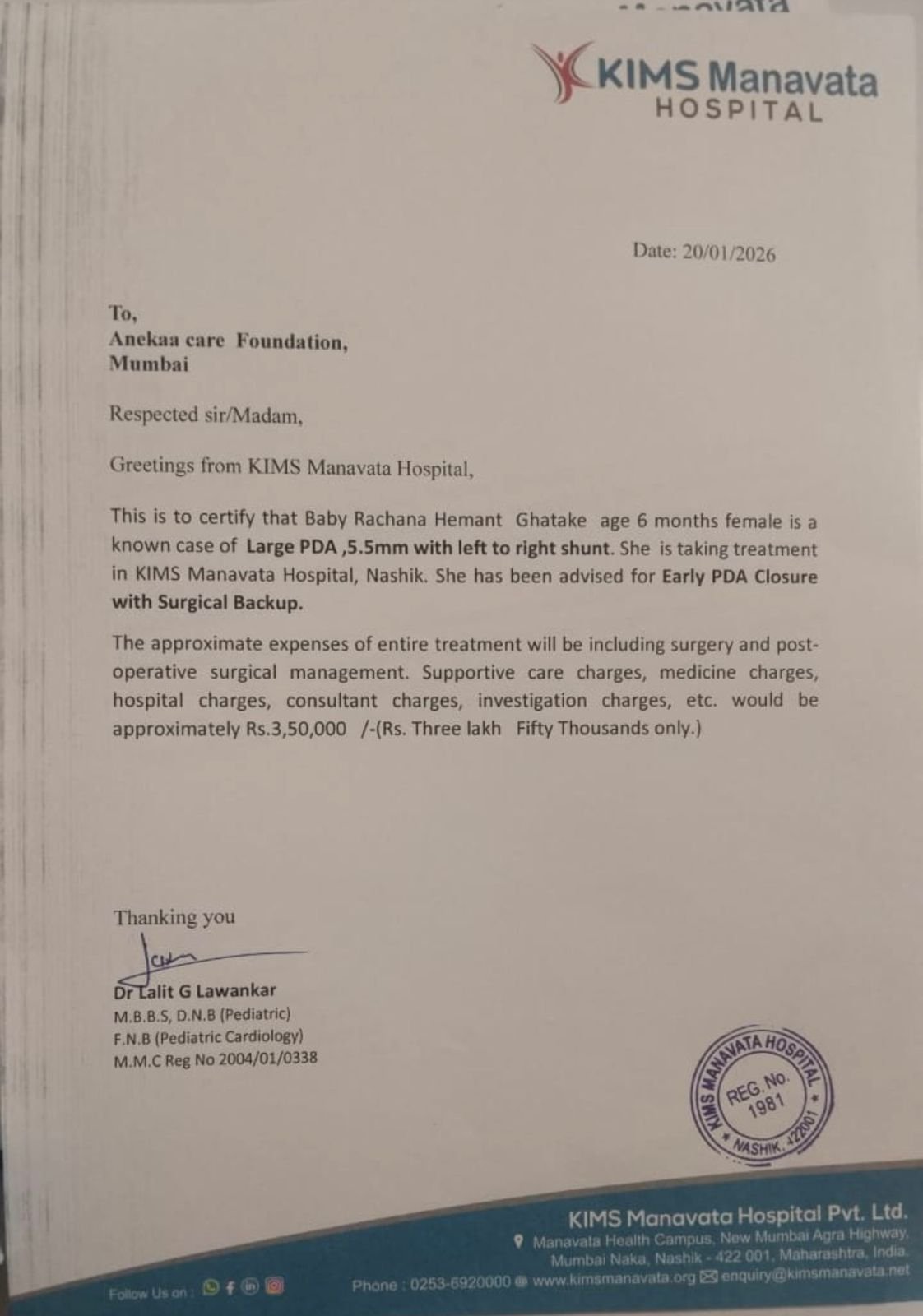 Baby Rachana Hemant Ghatake is just 6 months old and is battling a serious congenital heart condition known as Large PDA (Patent Ductus Arteriosus – 5.5 mm) with Left to Right Shunt. In this condition, a major blood vessel that should close after birth remains open, causing excessive blood flow to the lungs and dangerous strain on the heart. Doctors at KIMS Manavata Hospital, Nashik have advised urgent early PDA closure surgery with surgical backup. Without timely intervention, her condition can rapidly worsen and become life-threatening.