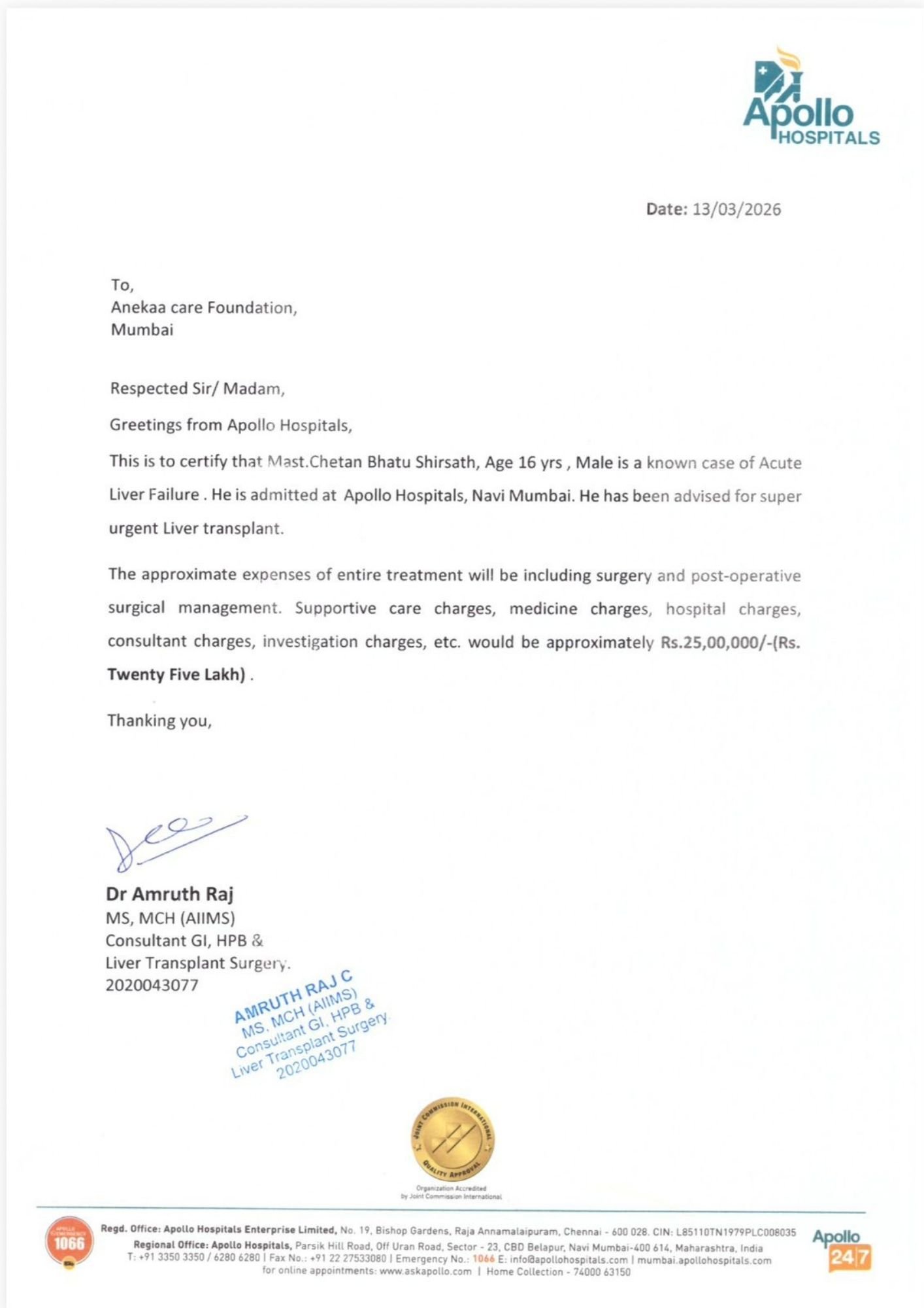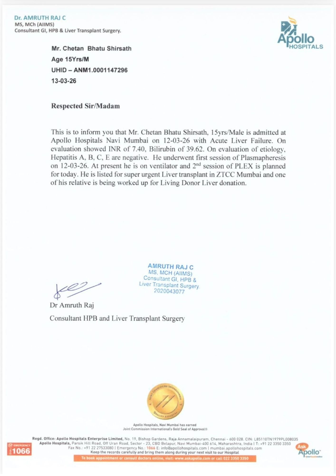 Chetan has been admitted to Apollo Hospitals, Navi Mumbai, where doctors have confirmed that he requires a super urgent Liver Transplant to survive. His condition is extremely critical and he is currently under intensive medical care.