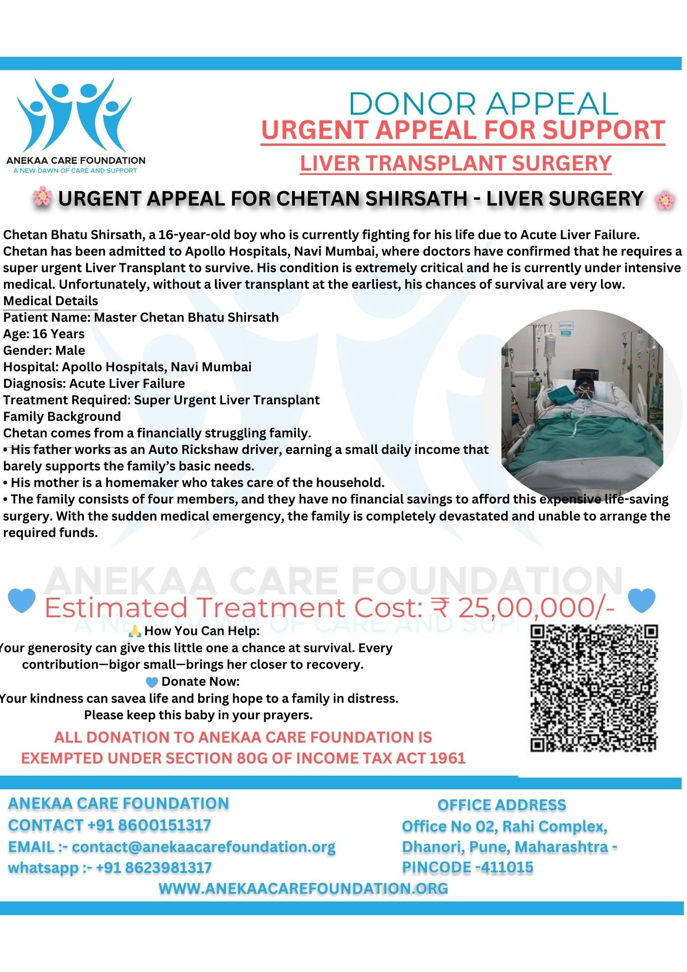 At Anekaa Care Foundation, we believe every child deserves a chance to live a healthy life. Today we are seeking urgent support for Master Chetan Bhatu Shirsath, a 16-year-old boy who is currently fighting for his life due to Acute Liver Failure.