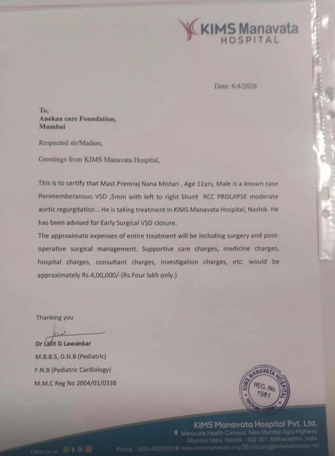 Doctors have strongly advised urgent heart surgery (VSD closure) to save his life.