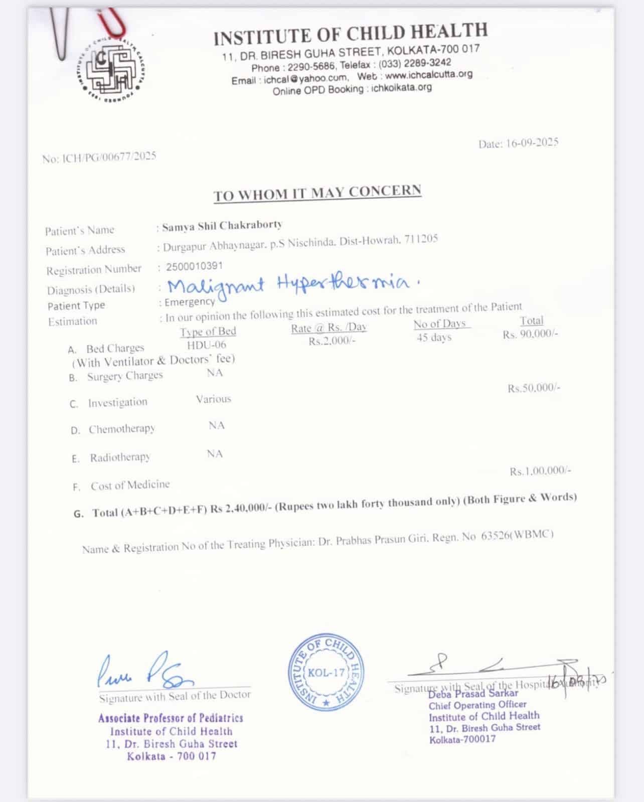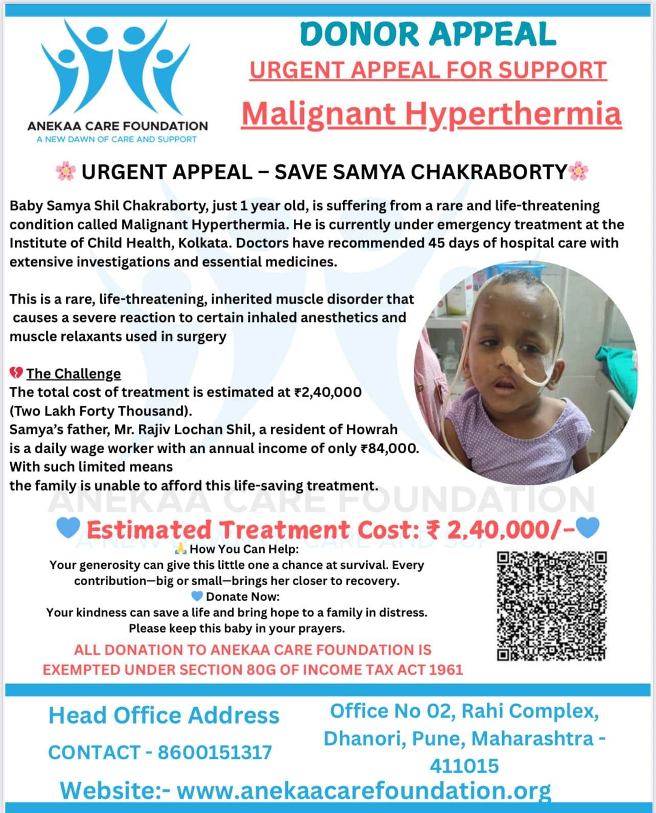 Master Samya Shil Chakraborty, just 2 years old, is battling Malignant Hyperthermia — a rare and life-threatening medical condition. He has been admitted to the Institute of Child Health, Kolkata, where doctors have recommended 45 days of hospital care, including continuous monitoring, critical investigations, and life-saving medicines. Immediate and uninterrupted treatment is the only hope for his survival.