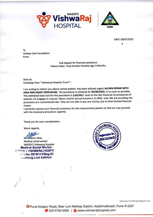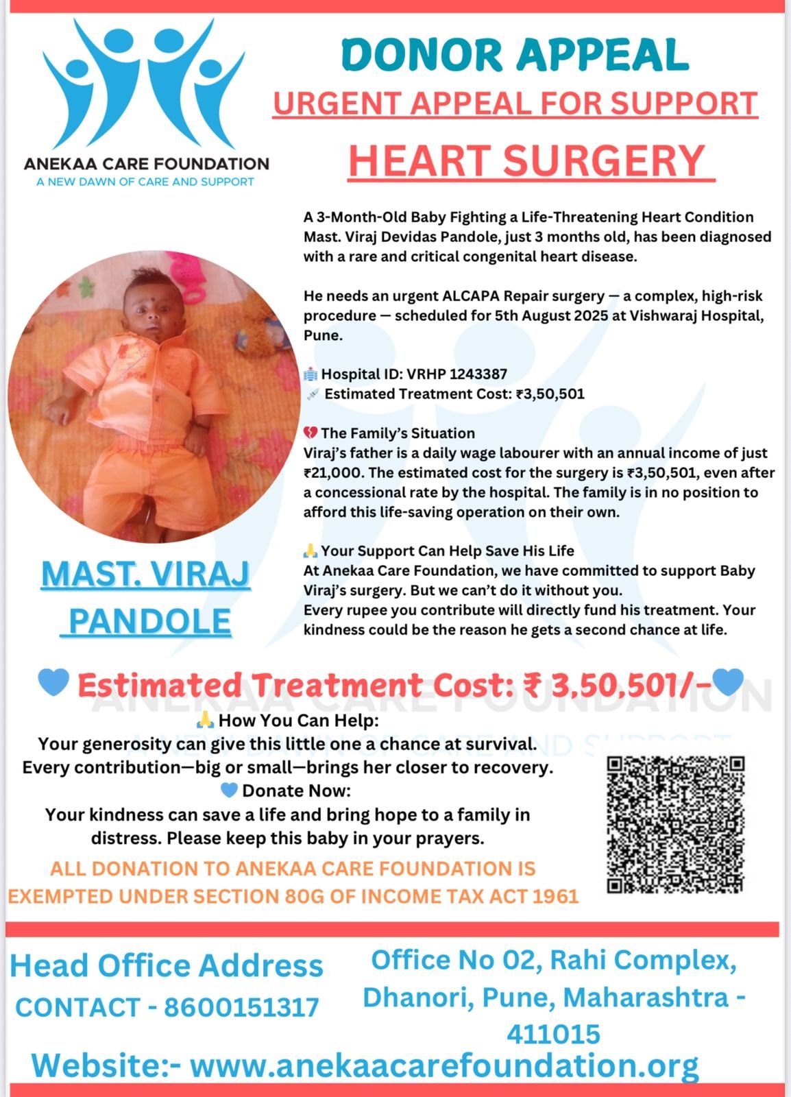 Anekaa Care Foundation urgently appeals for your kind support to help save the life of 3-month-old Baby Viraj Devidas Pandole, who is battling a severe congenital heart defect (ALCAPA) — a life-threatening condition that requires immediate open-heart surgery.