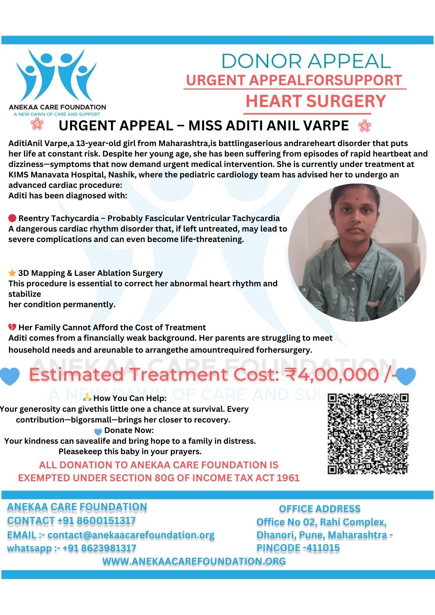 Aditi Anil Varpe, a 13-year-old girl from Maharashtra, is battling a serious and rare heart disorder that puts her life at constant risk. Despite her young age, she has been suffering from episodes of rapid heartbeat and dizziness—symptoms that now demand urgent medical intervention.