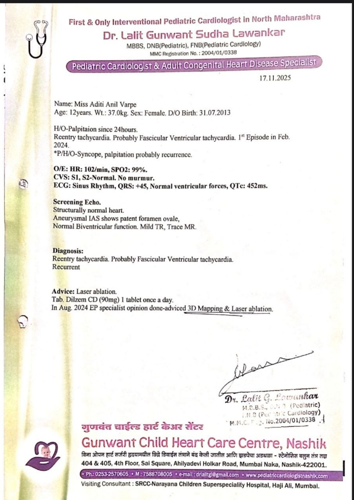 She is currently under treatment at KIMS Manavata Hospital, Nashik, where the pediatric cardiology team has advised her to undergo an advanced cardiac procedure: