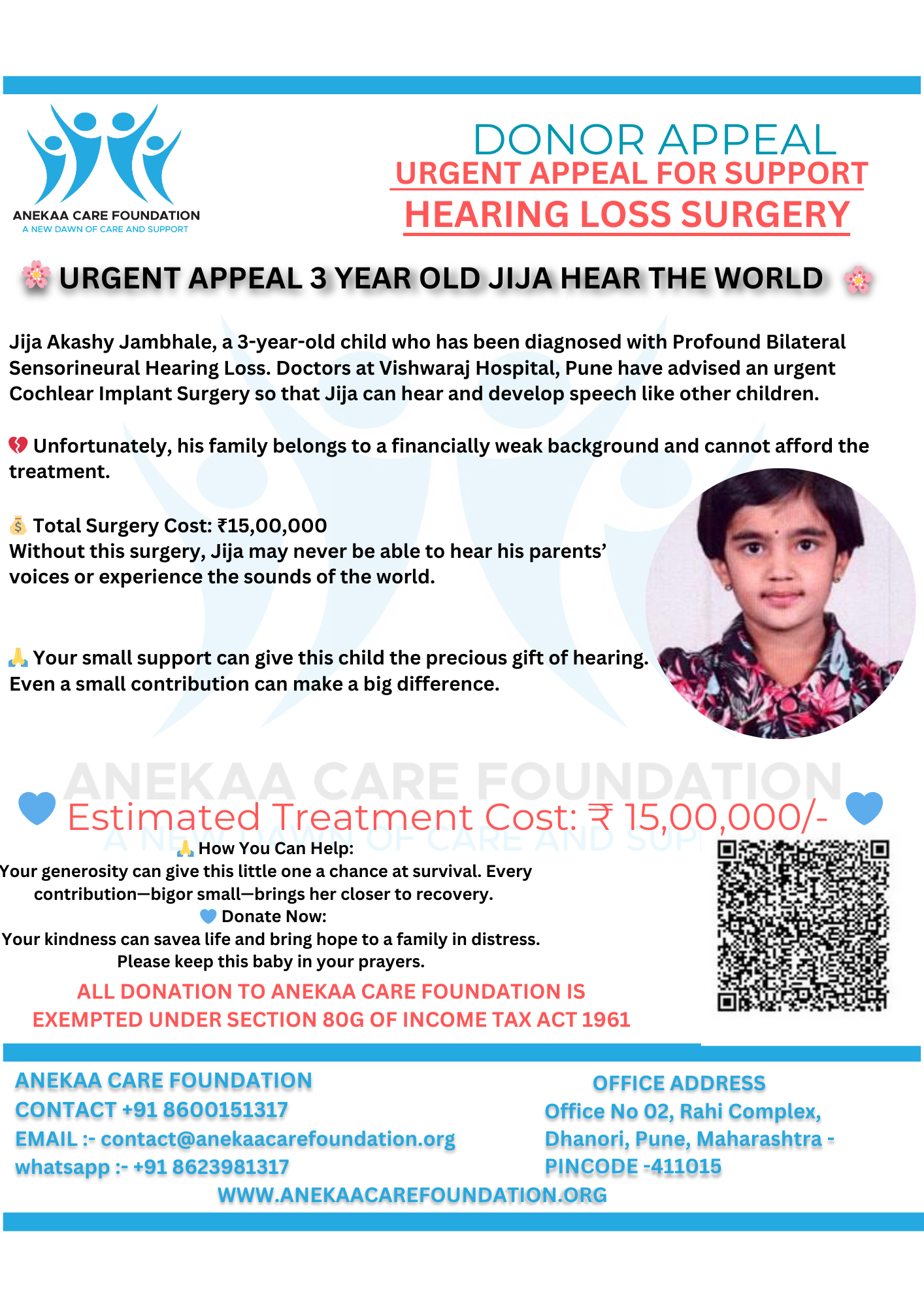 Her parents do not have the financial resources required to arrange ₹15,00,000 for treatment. Without external support, the family cannot provide the surgery that could completely change their child’s future.