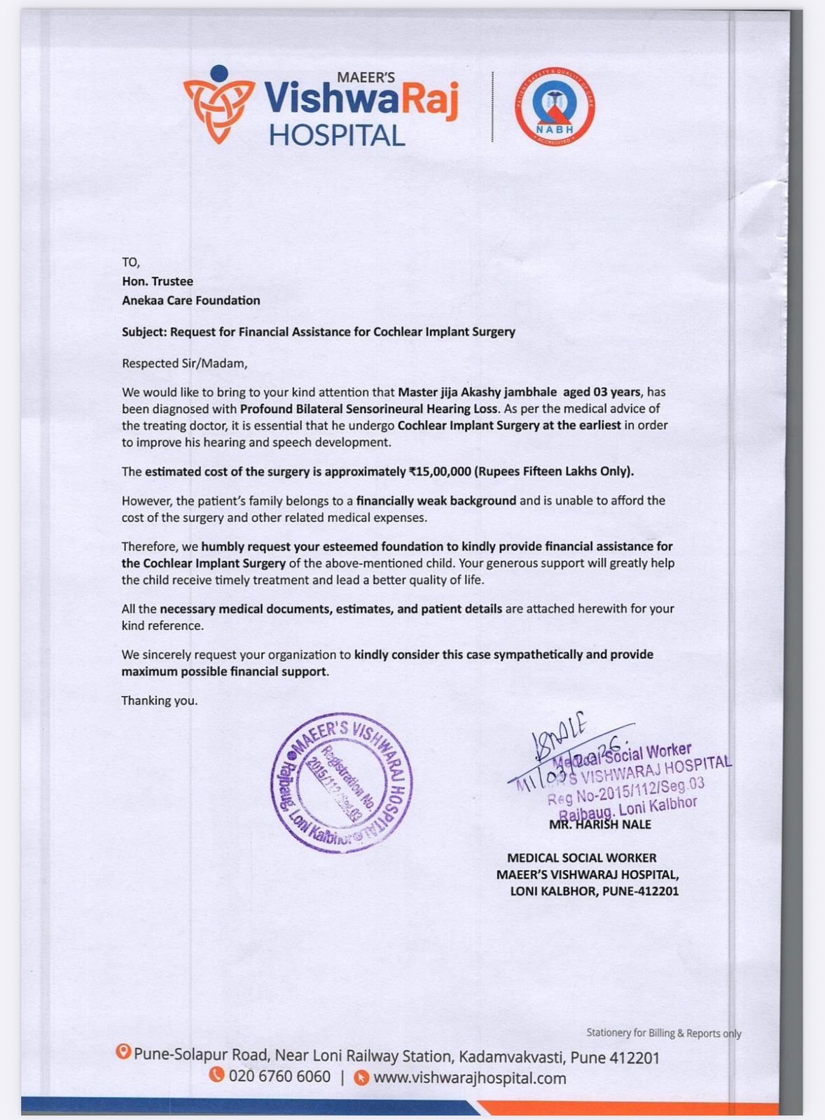 Miss Jija Akashy Jambhale, a 3-year-old child, has been diagnosed with Profound Bilateral Sensorineural Hearing Loss, a severe hearing condition that prevents her from hearing sounds normally.