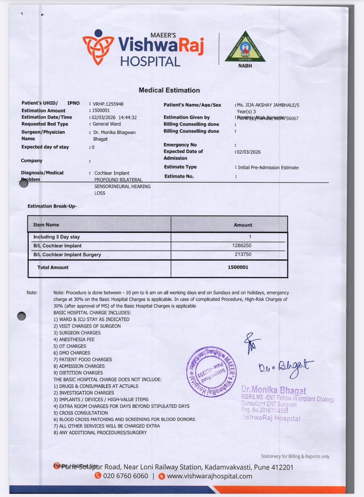 Doctors at Vishwaraj Hospital, Pune have advised urgent Cochlear Implant Surgery, a specialized procedure that can restore her ability to hear and help her develop speech like other children.