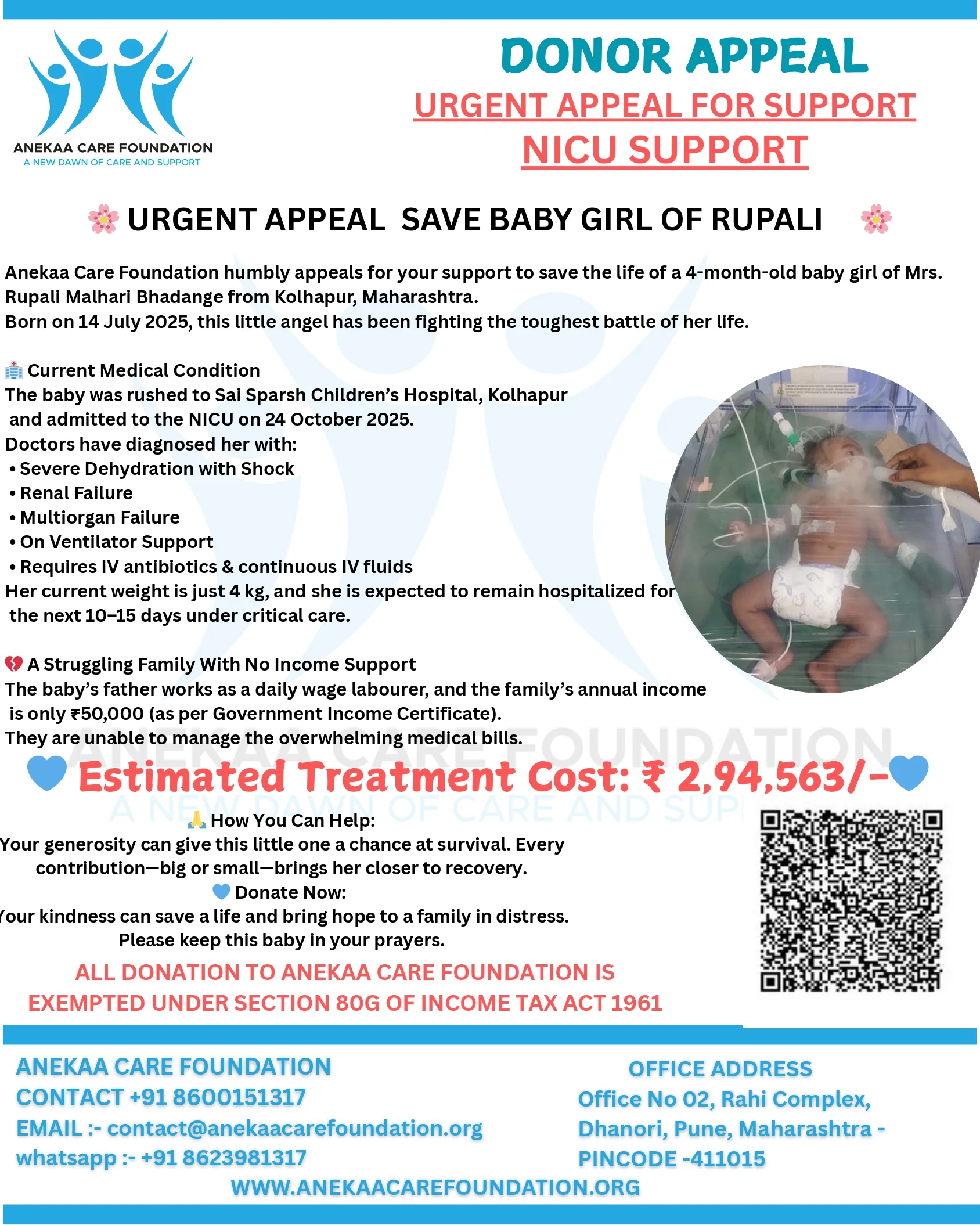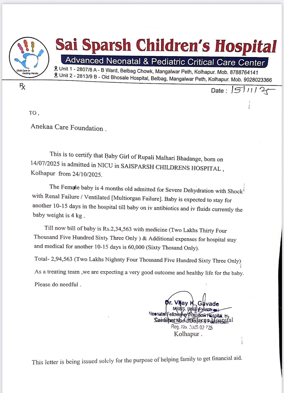 Baby girl of Mrs. Rupali Malhari Bhadange, just 4 months old from Kolhapur, Maharashtra, is fighting for her life in the NICU at Sai Sparsh Children’s Hospital.
