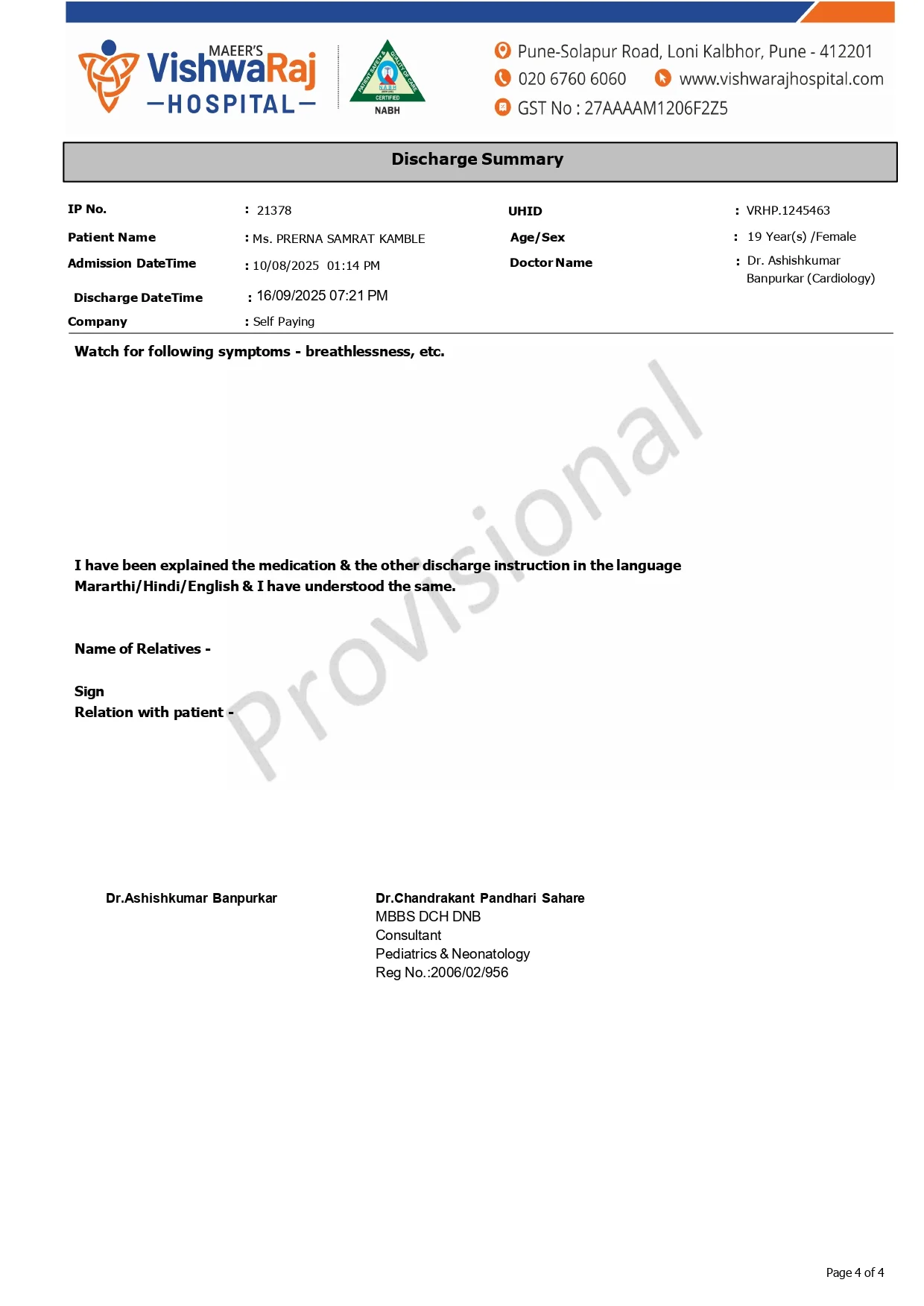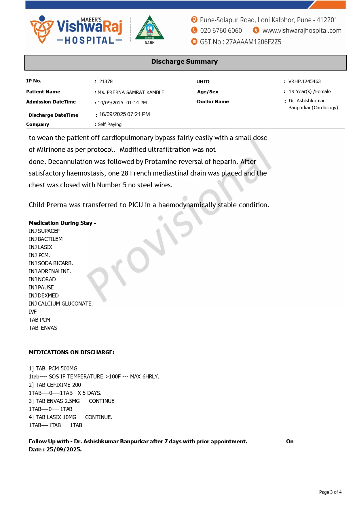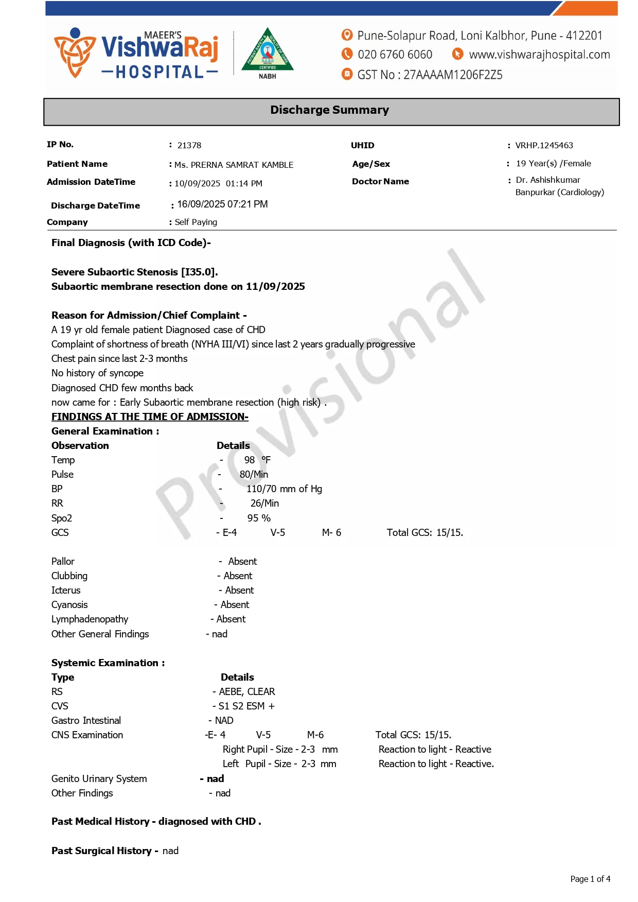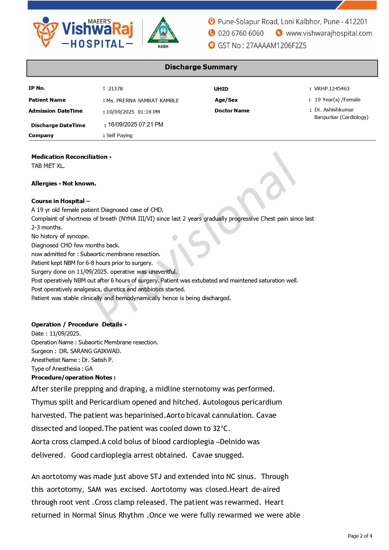 Because of your compassion, 19-year-old Prerna Samrat Kamble received the life-saving treatment she urgently needed. She was suffering from Severe Subaortic Stenosis, a dangerous congenital heart condition that had been progressively worsening for two years. Her surgery — Subaortic Membrane Resection performed on 11/09/2025 — was critical and required immediate intervention.Thanks to your support, Prerna was admitted to Vishwaraj Hospital, Pune, where she received advanced cardiology care under expert specialists. The medical team performed a complex procedure, ensuring stable hemodynamics throughout surgery. Post-operation, Prerna responded well, maintained stable vitals, and gradually regained strength under professional monitoring.Today, Prerna has been discharged in a hemodynamically stable condition. She has been advised medication management and follow-ups to ensure full recovery. This hopeful outcome was made possible because of your kindness and willingness to uplift someone in need.From Prerna and her family — thank you for bringing hope, stability, and a new beginning. Your generosity didn’t just fund a surgery — it gave a young girl a renewed chance at life.Let’s continue spreading healing and humanity, one life at a time.