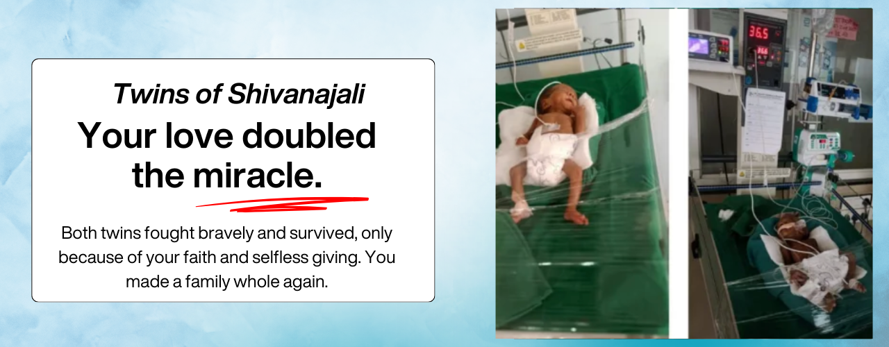 In moments when hope was fading and lives hung by a fragile thread, you became the light that illuminated the path to recovery. With every contribution you made, you didn’t just offer financial support — you gifted life, dignity, and a future to those who were struggling to hold on. Because of your selfless giving, Twins Of Shivanajali received life-saving medical treatment that once seemed out of reach for their family. You didn’t just donate — you became a part of their journey, their strength, and their miracle. Parents who once prayed with trembling hands now cradle their children with gratitude in their eyes. Children who once fought silent battles in hospital beds now laugh, play, and dream — because of you. Your compassion crossed every boundary of distance and background. You proved that humanity shines brightest in times of need. On behalf of the grateful families, the little warriors who fought their battles bravely, and the entire Anekaa Care Foundation team —we extend our deepest, most heartfelt gratitude to you. You are not just donors — You are life-changers, hope-restorers, and silent heroes of countless untold stories. Let’s continue weaving stories of survival, strength, and smiles together. Because every child deserves a life filled with dreams — and because you have shown the world what true kindness looks like.